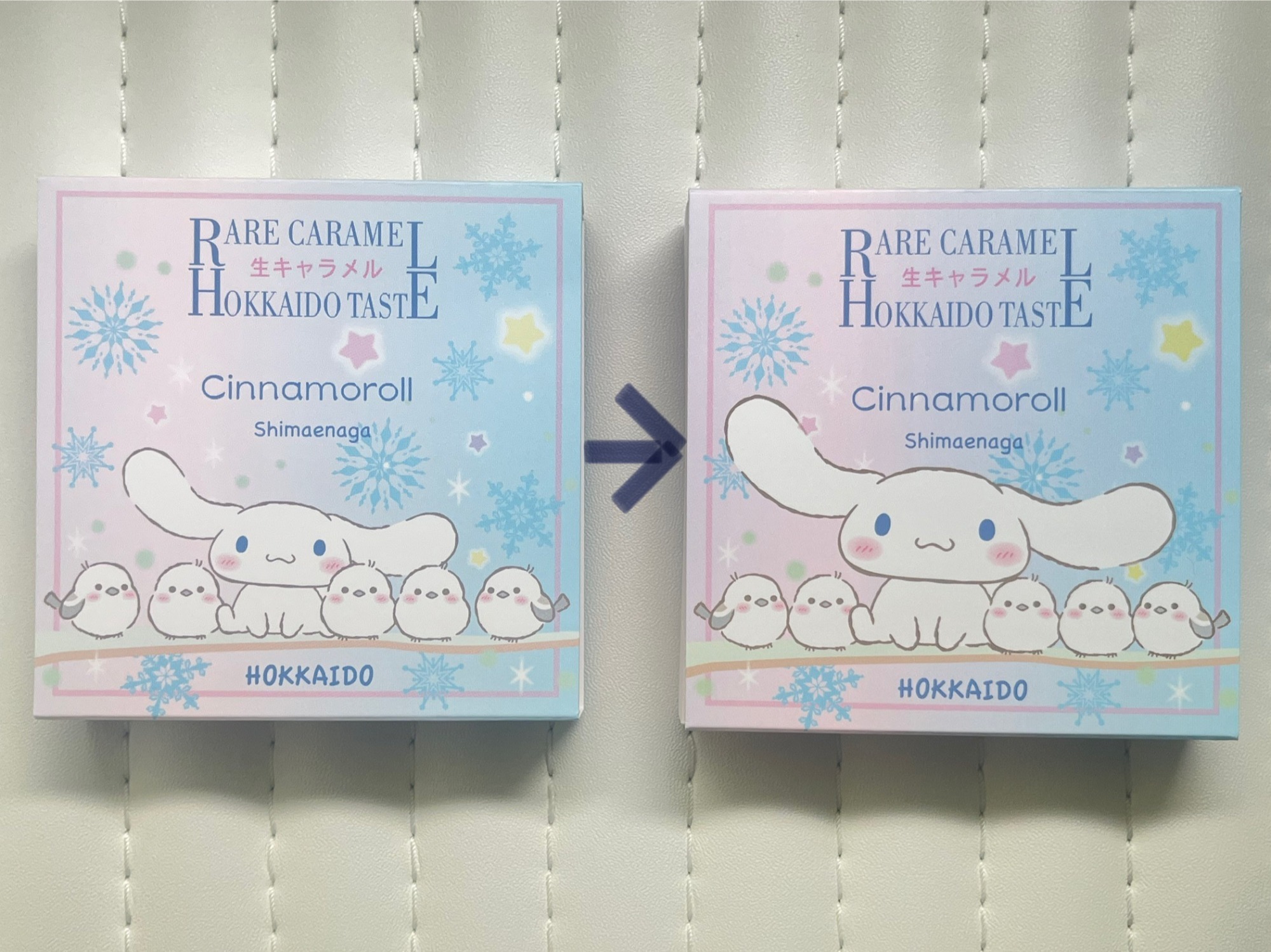 2025/10/2 シナモロールシマエナガ生キャラメルのパッケージをリニューアルしました。シナモロールのイラストのサイズが大きくなって、更に可愛くなりました。
